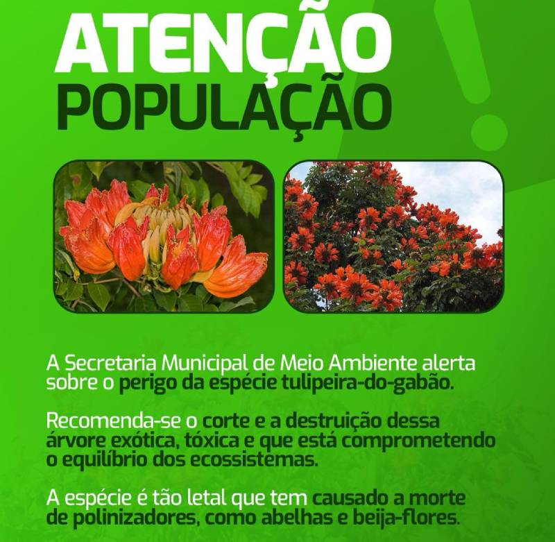 A tulipeira-do-gabão precisa ser erradicada de Pato Branco, por comprometer o equilíbrio dos ecossistemas. A espécie é tão letal que outros estados também estão adotando medidas de erradicação, a exemplo de Santa Catarina, que lançou a campanha “Flora Exótica Tóxica para Fauna – Espatódea”, que alerta sobre os riscos ambientais da árvore Spathodea campanulata, conhecida como espatódea, bisnagueira ou tulipeira-do-gabão. Essa ação de Santa Catarina reforça o cumprimento da Lei Estadual nº 17.694/2019 que proíbe a produção, o plantio e a manutenção da espécie em todo o estado catarinense.