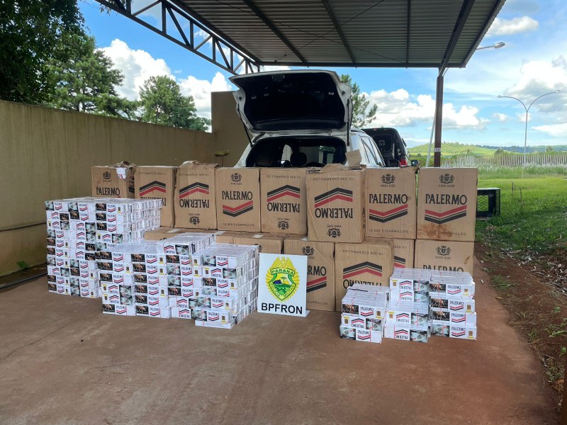 A Polícia Militar do Paraná, por meio do Batalhão de Polícia de Fronteira (BPFRON), realizou na noite deste sábado (17) a apreensão de um veículo carregado com cigarros contrabandeados do Paraguai na rodovia PR-182, nas proximidades do município de Francisco Beltrão, no âmbito da Operação Protetor de Divisas e Fronteiras. Durante patrulhamento, a equipe policial visualizou um veículo VW/T-Cross, de cor branca, trafegando em alta velocidade e realizando ultrapassagens proibidas, colocando em risco a segurança dos demais usuários da via. Diante da infração, foi dada ordem de parada com sinais sonoros e luminosos, a qual não foi acatada pelo condutor, que empreendeu fuga.