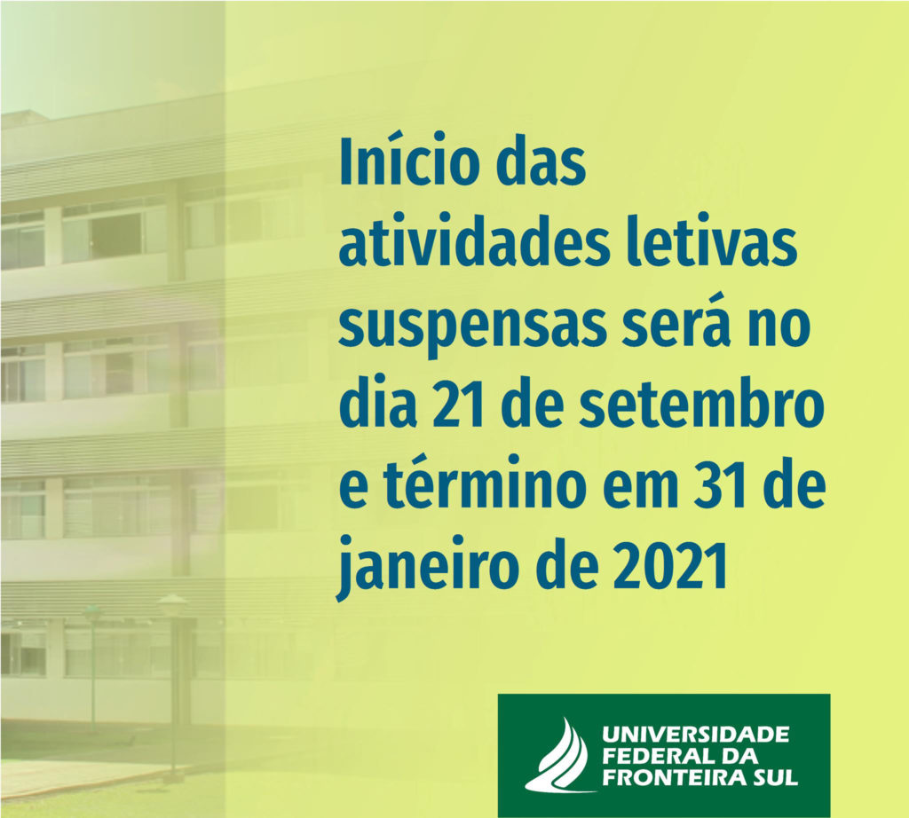 Foi aprovado, na 10ª Sessão Extraordinária do Conselho Universitário (CONSUNI) da Universidade Federal da Fronteira Sul (UFFS), na última quinta-feira (3), o Calendário Acadêmico Especial Unificado para o retorno das atividades letivas suspensas no semestre 2020.1. De acordo com a Resolução nº 41/CONSUNI/UFFS/2020, foram definidas as datas de retomada e de final do semestre letivo 2020.1, respectivamente, dia 21 de setembro de 2020 e dia 30 de janeiro de 2021.