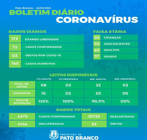 Boletim da Secretaria Municipal de Saúde informa o registro de novos em Pato Branco. De 4.301 para 4.373 casos de Covid-19, 53...