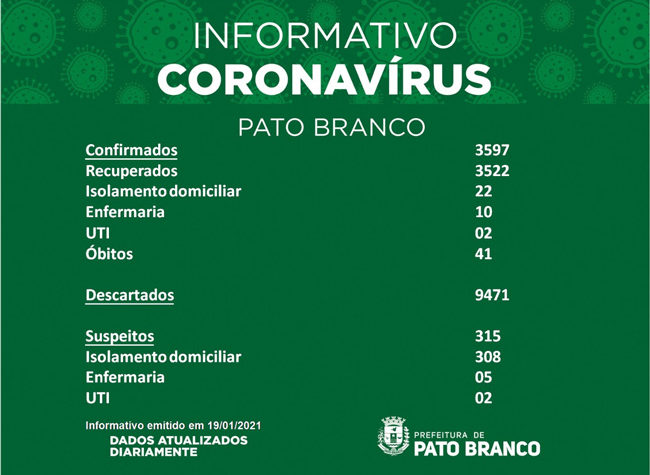 Boletim da Secretaria Municipal de Saúde informa o registro de novos em Pato Branco. De 3.568 para 3.597 casos de Covid-19,...