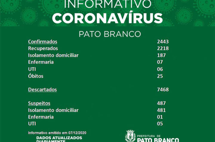 Boletim da Secretaria Municipal de Saúde informa o registro de novos em Pato Branco. De 2.413 para 2.443 casos de Covid-19,...