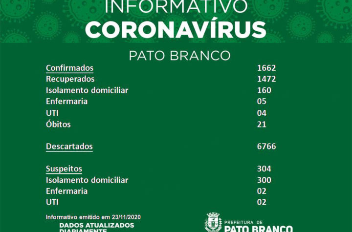 Boletim da Secretaria Municipal de Saúde informa o registro de novos em Pato Branco. De 1.652 para 1.662 casos de Covid-19,...