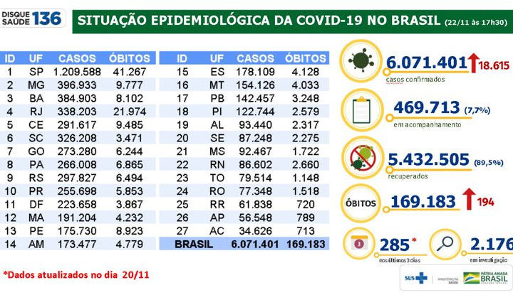 O balanço divulgado neste domingo (22) pelo Ministério da Saúde indica o acréscimo de 18.615 novos casos de covid-19 nas...