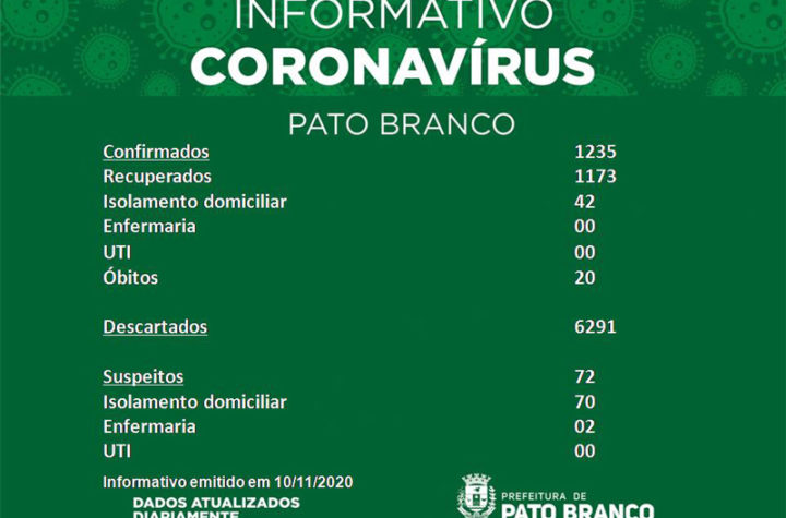 Boletim da Secretaria Municipal de Saúde informa o registro de novos em Pato Branco. De 1.229 para 1.235 casos de Covid-19,...