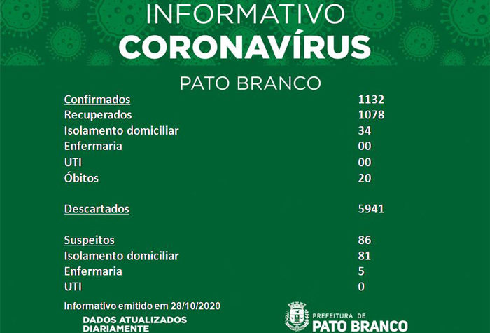 Boletim da Secretaria Municipal de Saúde informa o registro de novos em Pato Branco. De 1.117 para 1.132 casos de Covid-19,...