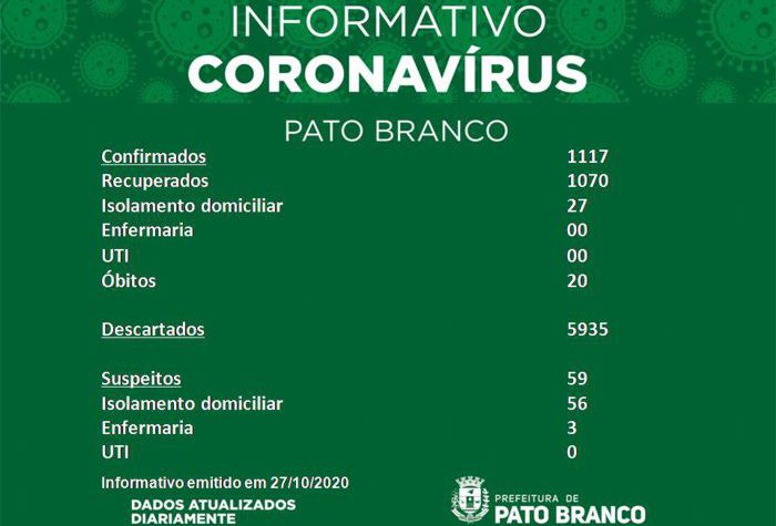 Boletim da Secretaria Municipal de Saúde informa o registro de novos em Pato Branco. De 1.107 para 1.117 casos de Covid-19,...