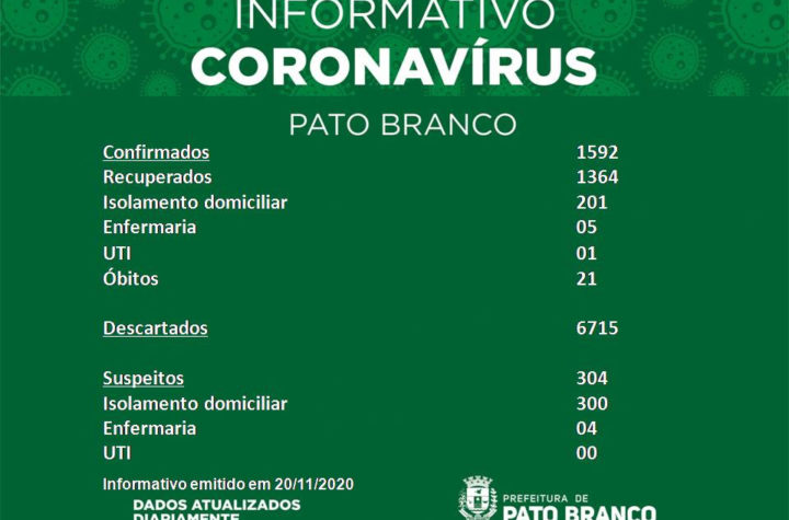 Boletim da Secretaria Municipal de Saúde informa o registro de novos em Pato Branco. De 1.567 para 1.592 casos de...