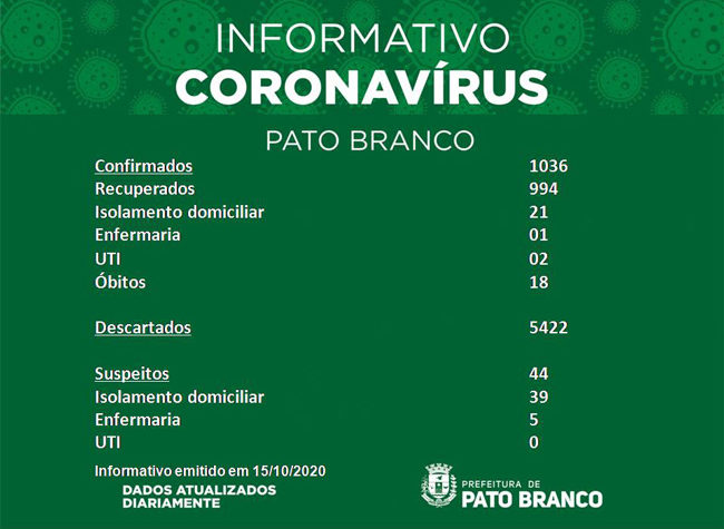 Boletim da Secretaria Municipal de Saúde informa o registro de novos em Pato Branco. De 1030 para 1036 casos de Covid-19,...
