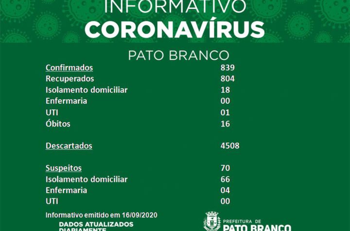 Boletim da Secretaria Municipal de Saúde informa o registro de novos casos em Pato Branco. De 838 para 839 casos...