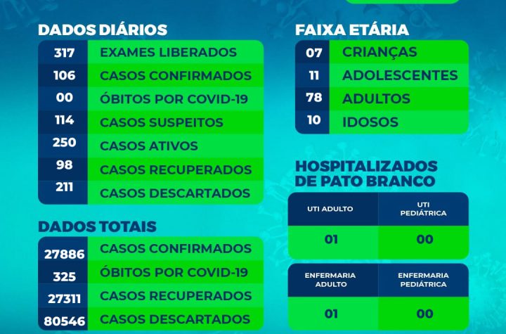 Boletim da Secretaria Municipal de Saúde informa o registro de novos casos em Pato Branco. De 27.780 para 27.886 casos de...