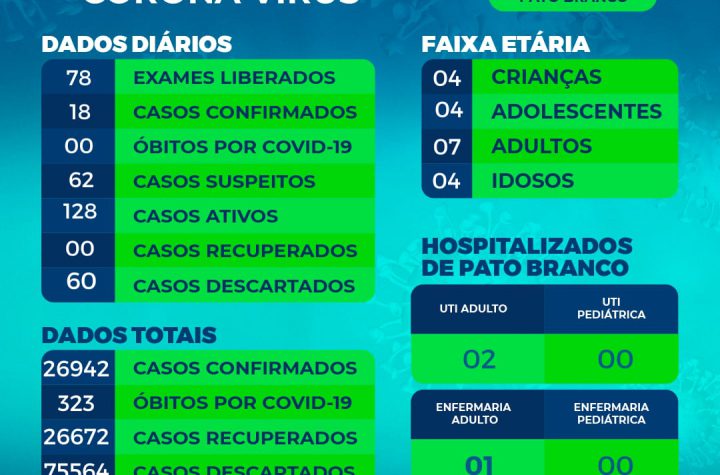 Boletim da Secretaria Municipal de Saúde informa o registro de novos casos em Pato Branco. De 26.924 para 26.942 casos de...