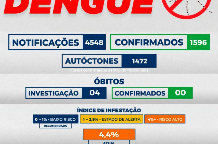 O Boletim da Secretaria de Saúde divulgado nesta sexta-feira, dia 06, continua registrando risco alto para dengue. O índice de...
