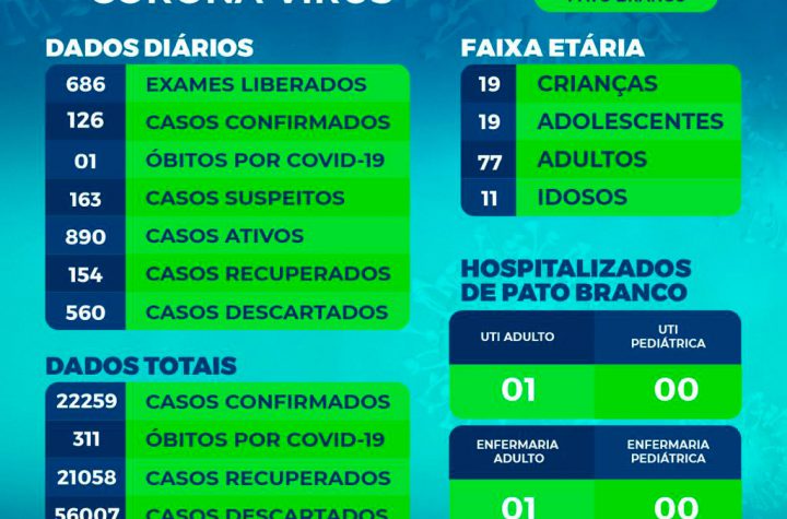 Boletim da Secretaria Municipal de Saúde informa o registro de novos casos em Pato Branco. De 22.133 para 22.259 casos de...