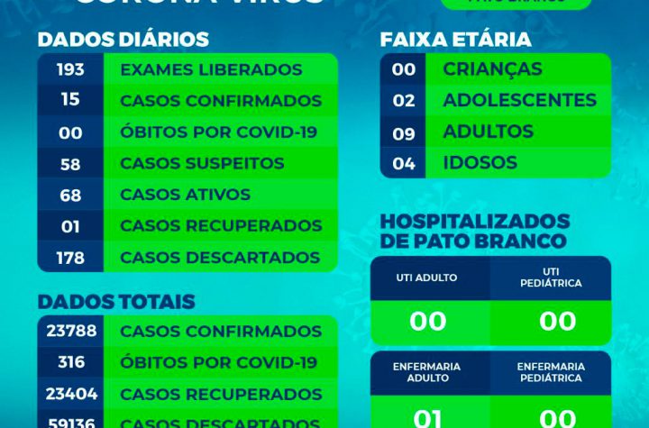 Boletim da Secretaria Municipal de Saúde informa o registro de novos casos em Pato Branco. De 23.773 para 23.788 casos de...