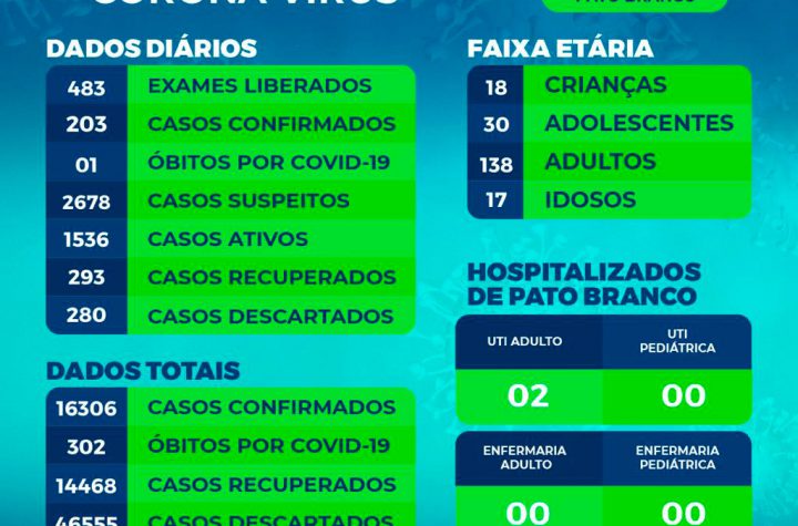 Boletim da Secretaria Municipal de Saúde informa o registro de novos casos em Pato Branco. De 15.103 para 16.306 casos de...