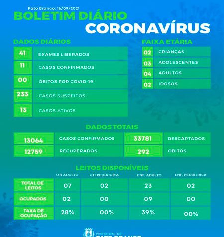 Boletim da Secretaria Municipal de Saúde informa o registro de novos em Pato Branco. De 13.053 para 13.064 casos de...