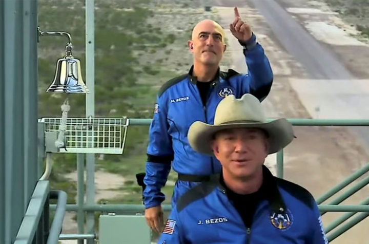 Jeff Bezos, o homem mais rico do mundo, e três tripulantes voaram sobre o deserto do Texas a bordo do...