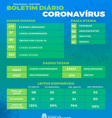 Boletim da Secretaria Municipal de Saúde informa o registro de novos em Pato Branco. De 12.010 para 12.047 casos de Covid-19, 270...