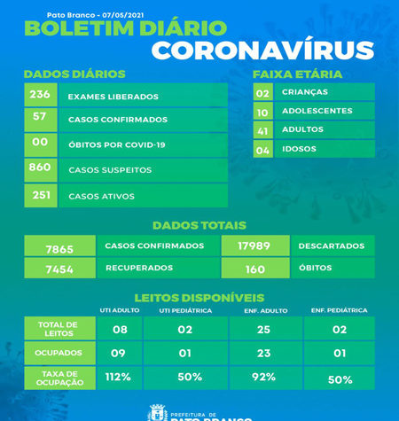 Boletim da Secretaria Municipal de Saúde informa o registro de novos em Pato Branco. De 7.810 para 7.865 casos de Covid-19, 160...