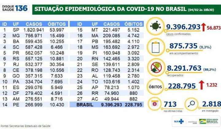 O número de pessoas que não resistiram à covid-19 no Brasil subiu para 228.795. Em 24 horas, foram registradas 1.232...
