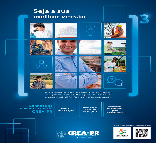 A plataforma Pró-Crea 2.0, que oferece cursos on-line do Conselho Regional de Engenharia e Agronomia do Paraná (Crea-PR), abre nesta terça-feira (24), as inscrições para três cursos de aperfeiçoamento profissional. Com carga horária de oito horas cada, são destinados aos profissionais regularmente registrados no Crea-PR, estudantes que integram o CreaJr-PR e funcionários do próprio Conselho.
