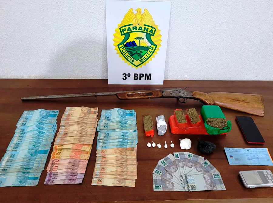 Mais tarde, na residência no bairro Eldorado, foi localizada uma espingarda cal. 32, sem marca aparente, R$ 9.122,00 em diversas cédulas, um cheque no valor de R$ 500,00, ainda, 1,097 kg de substância análoga à maconha e 76,7 gramas de substância análoga à cocaína. O envolvido recebeu voz de prisão e foi encaminhado juntamente com o material apreendido para os procedimentos legais cabíveis.