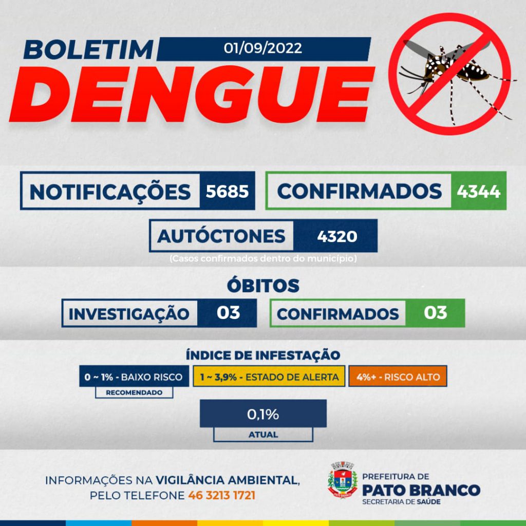 Boletim da Secretaria de Saúde informa que no Município de Pato Branco o risco para dengue está em 0,1%. Conforme os dados, emitidas 5.685 notificações e confirmados 4.344 casos. Os casos confirmados dentro de Município totalizam 4,320 autóctones. Três óbitos que estão sob investigação. Registro de três óbitos por dengue.Mais detalhes, clique aqui