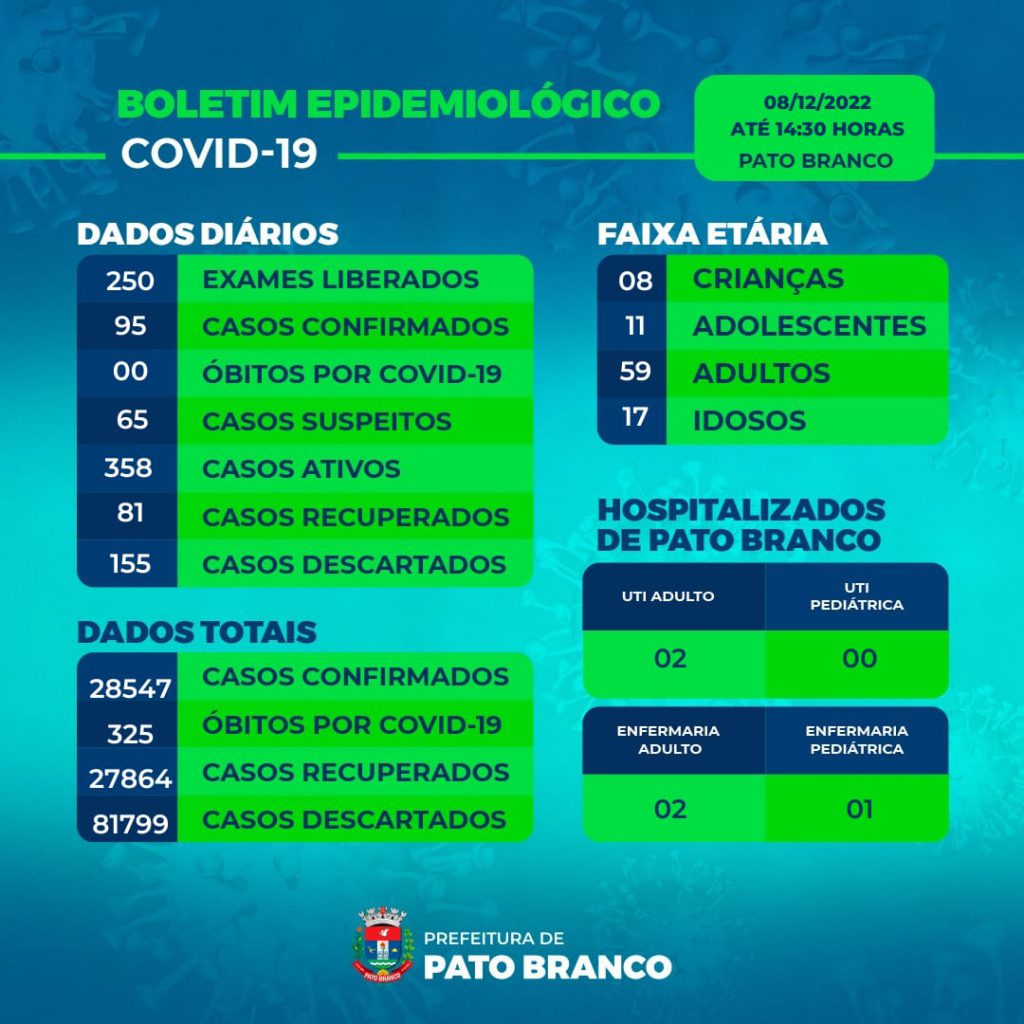 Boletim da Secretaria Municipal de Saúde informa o registro de novos casos em Pato Branco. De 28.452 para 28.547 casos de Covid-19, 325 óbitos, recuperados 27.864. 02 pacientes internados em enfermaria, 02 pacientes em leito de UTI. UTI pediátrica 00 pacientes. Enfermaria Pediátrica 01 pacientes. Casos descartados 81.799. Aguardando resultados 65 pessoas e casos ativos 358. Diário: 81 recuperados e 155 descartados.