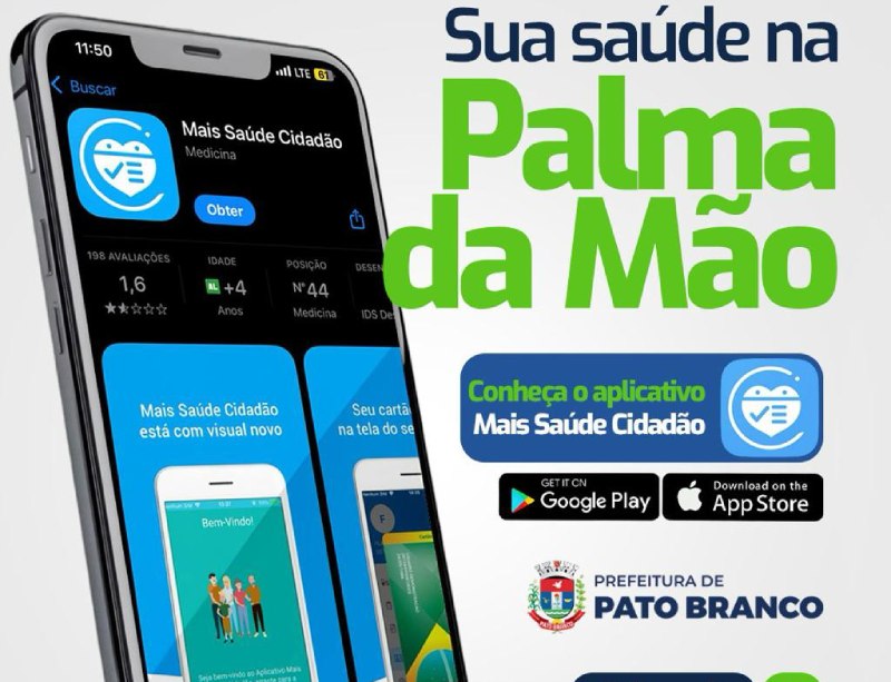 O município de Pato Branco conta agora com o “Mais Saúde Cidadão”, aplicativo da Secretaria Municipal de Saúde que facilita o acesso da população. O App é uma ferramenta que traz praticidade e transparência à rede pública de saúde, com informações, serviços e atendimentos. O aplicativo oferece mais agilidade ao atendimento, evitando filas e deslocamentos desnecessários, garantindo mais autonomia e transparência para a população acompanhar os serviços de saúde quando e onde quiser.