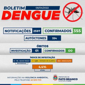 O Município de Pato Branco está em situação de emergência gerada pelo alto  índice de novos casos por dengue. O decreto foi assinado pelo prefeito Robson Cantu (PSD) nesta segunda-feira à tarde. A declaração de emergia prevê ações de prevenção e combater a proliferação do mosquito Aedes Aegypti.   Com a situação de emergência, a Secretaria Municipal de Saúde poderá, ainda, proceder à contratação temporária de pessoal, pelo prazo de 90  dias, prorrogável por igual período, desde que devidamente justificada e com a finalidade de atender às atividades do programa de combate à Dengue, com prévia anuência da Procuradoria Jurídica e do Chefe do Poder Executivo.Clique e confira o decreto na integra.