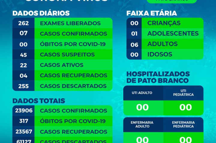 Boletim da Secretaria Municipal de Saúde informa o registro de novos casos em Pato Branco. De 23.899 para 23.906 casos de...